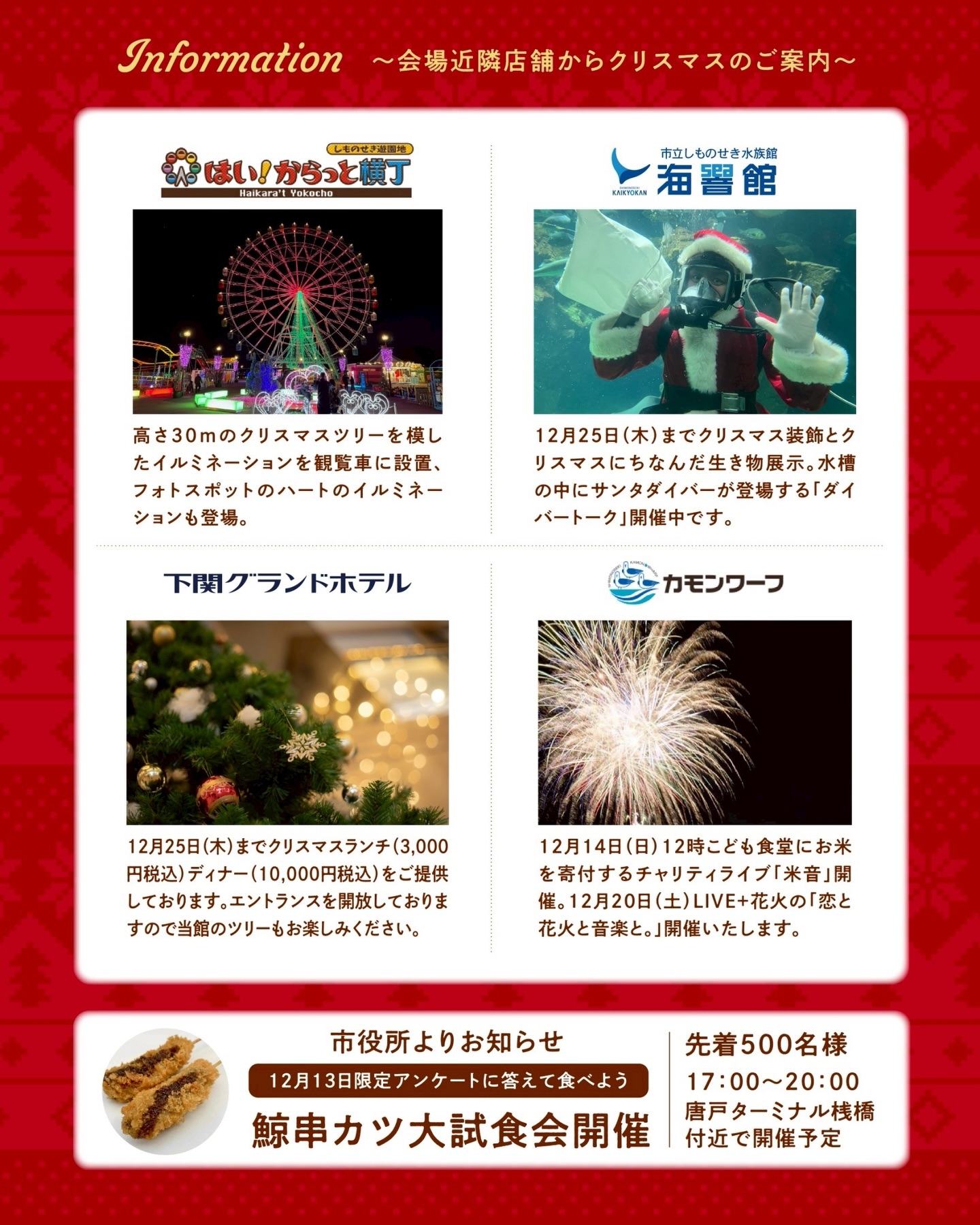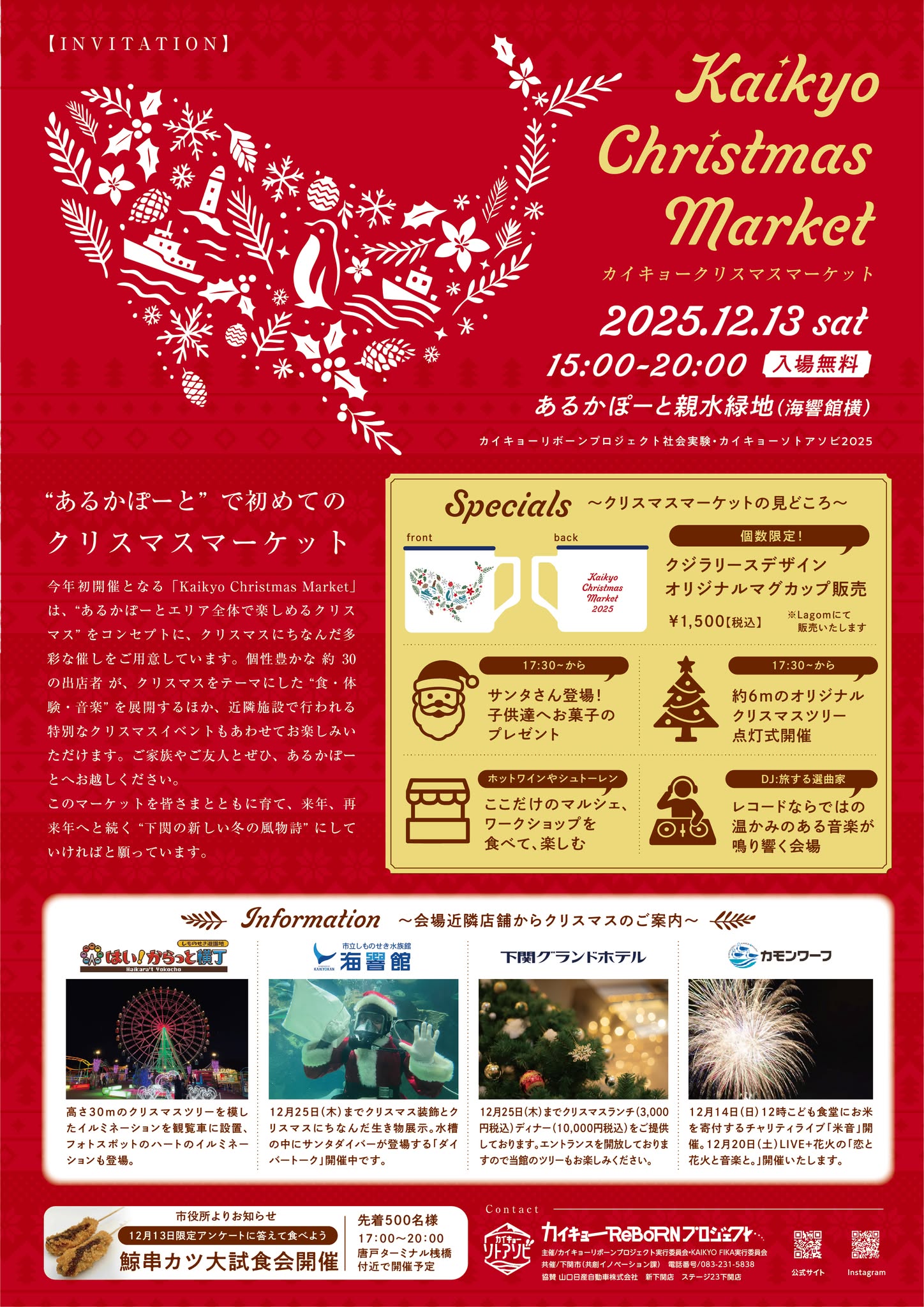 令和5年2月に策定した「あるかぽーと・唐戸エリアマスタープラン」では、"日本を代表するウォーターフロントシティ"の実現を目指しています。この計画の一環として、あるかぽーと親水緑地にて「カイキョークリスマスマーケット」を開催します。