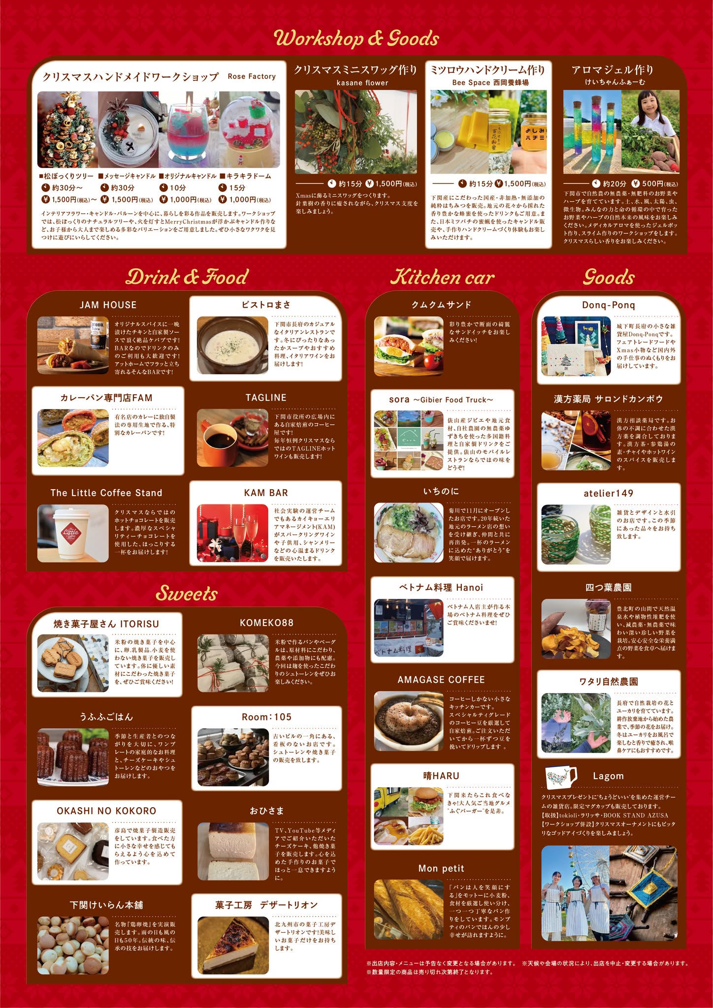本イベントは、あるかぽーとで初めてのクリスマスマーケットであり、個性豊かな30店舗以上の出店者がクリスマスをテーマにした「食・体験・音楽」を展開するほか、近隣施設で行われる特別なクリスマスイベントと併せてお楽しみいただけます。